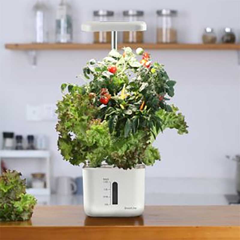 Systemet innehåller LED-växtbelysning, ett lock med plats för 4 pluggar, odlingslåda med inbyggd pump, 4 odlingspluggar, 4 odlingskorgar, pincett, 2 etiketthållare, 4 växthuskupor, 4 klisteretiketter, 2 hålskydd och en strömadapter.