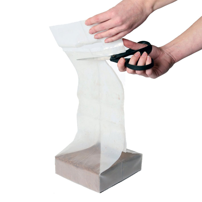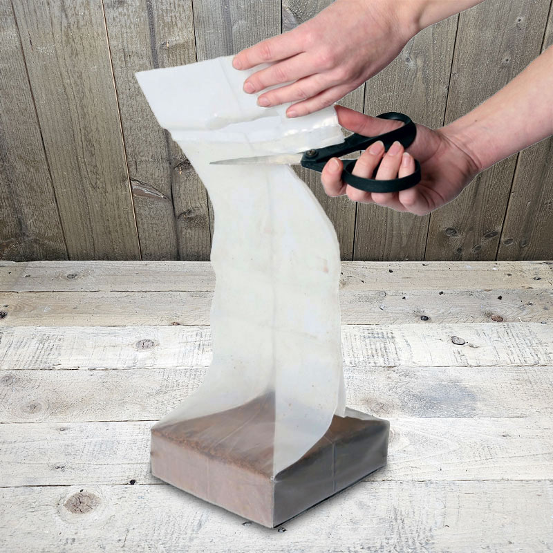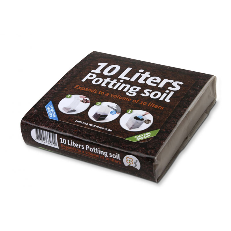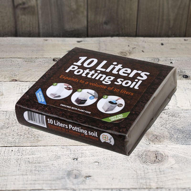 Den komprimerade kokosen expanderar till en volym på 10 liter.