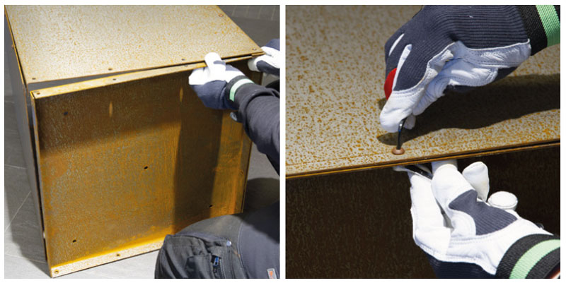 Använd handskar när du hanterar den orostade krukan. Det förhindrar fingeravtryck på materialet som kan synas när krukan senare rostar. För montering av krukan behöver du en torxnyckel nr 3 och en hylsnyckel nr 8. När du köper krukan är den orostad eller i början av sin rostning. Det tar upp till två år innan krukan är färdigrostad, beroende på väder och vind. När krukan fått sin gyllenbruna färg avstannar rostningen och krukan har ett skyddande lager som förhindrar genomrostning. Cortenstål är mycket hållbart.