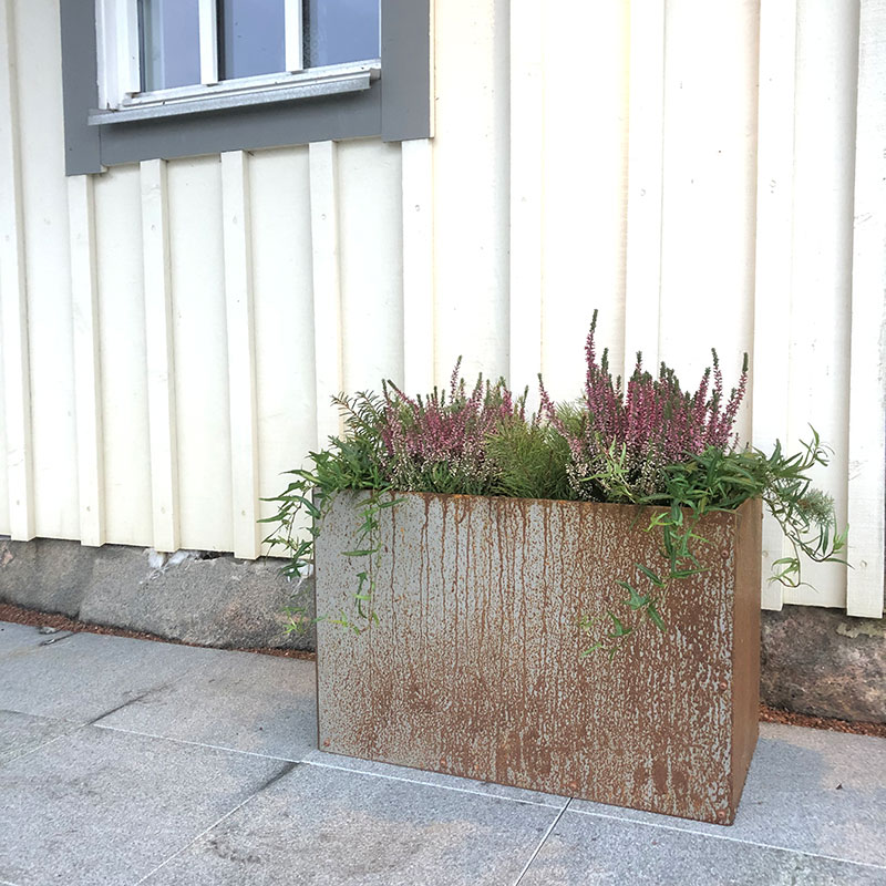 Dekorativ utekruka i 2 mm cortenstål. Cortenstål är ett hållbart material, som efter cirka två år avstannar i sin rostning och bildar ett skyddande lager. Krukan får därmed en väldigt god hållbarhet.