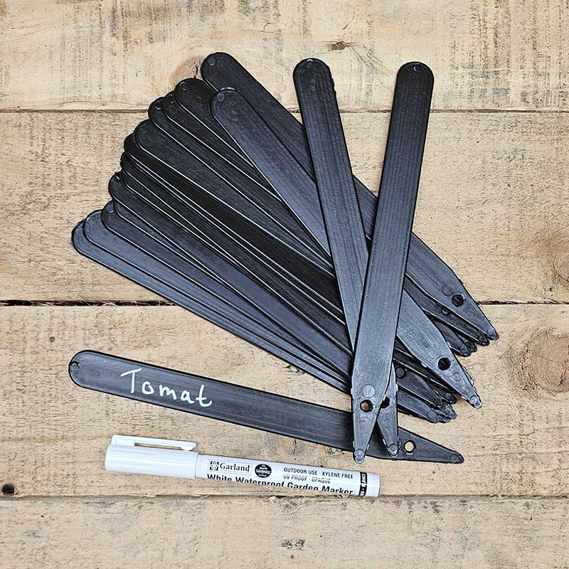 Svarta plastetiketter som används för att skriva namn på frösådder och växter. Kan enkelt tryckas ner i jorden eller knytas fast.