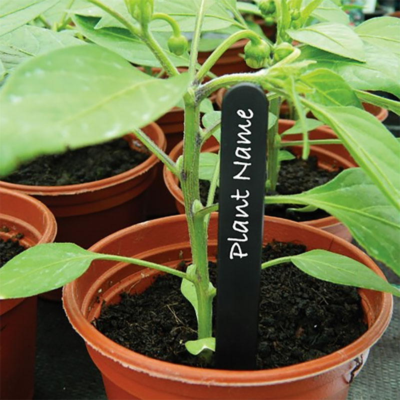 Svarta plastetiketter som används för att skriva namn på frösådder och växter.