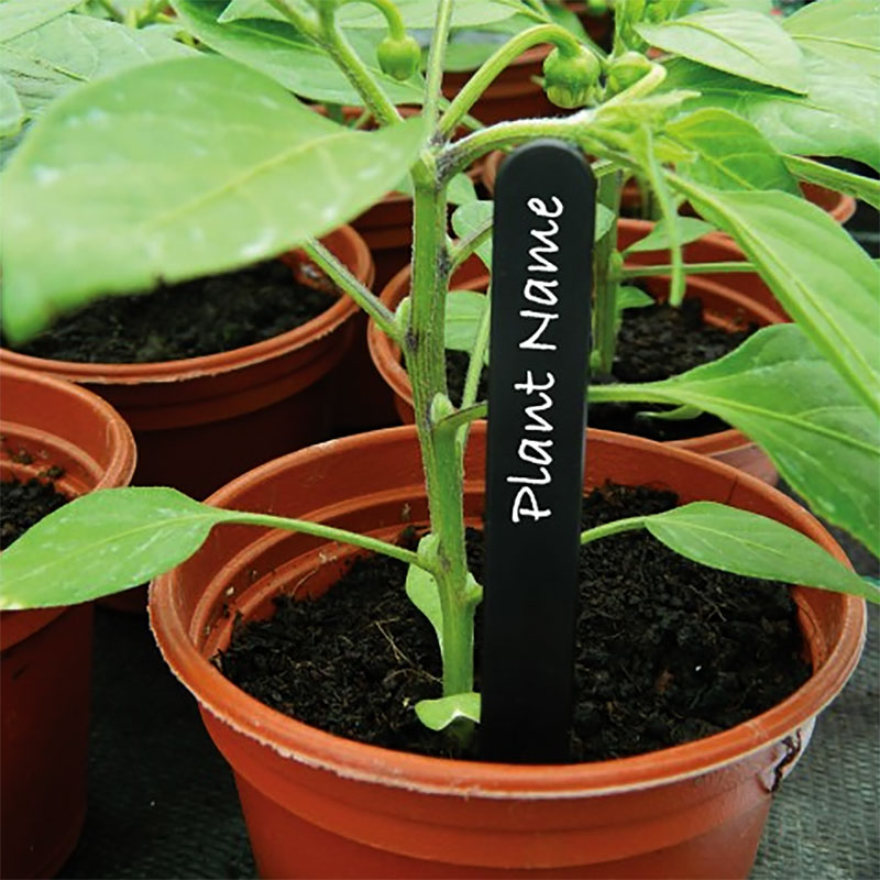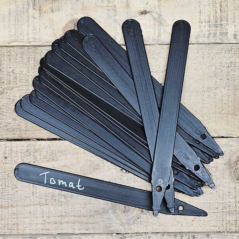 Svarta plastetiketter som används för att skriva namn på frösådder och växter.