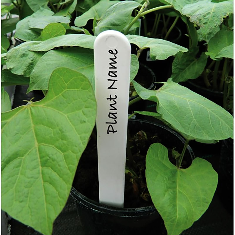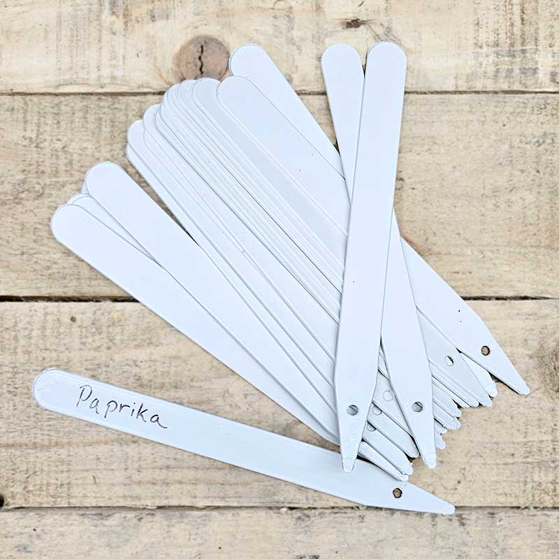 Vita plastetiketter som används för att skriva namn på frösådder och växter.