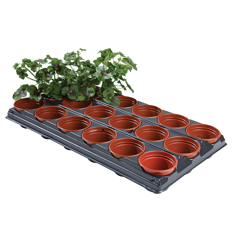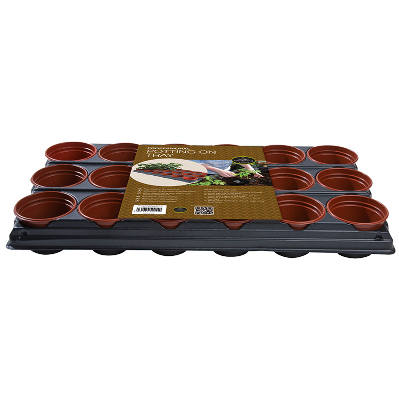 Brätte med 18 stycken terrakottafärgade krukor 9 cm i diameter. Lämpligt för bl.a uppskolning av frösådder och sticklingar.