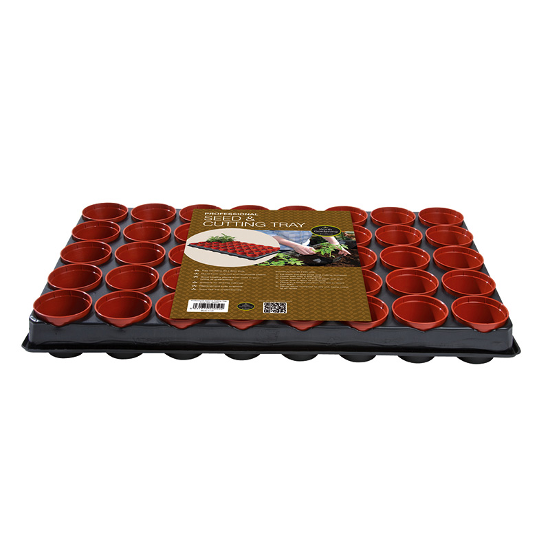 Brätte med 40 stycken terrakottafärgade krukor 6 cm i diameter. Lämpligt för frösådder och sticklingförökning.