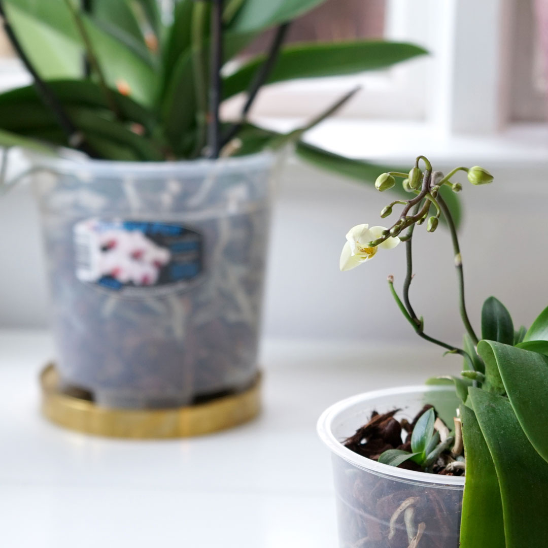 Genomskinliga plastkrukor är idealiska för många orkidéer som t.ex Phalaenopsis (brudorkidé) som trivs när ljuset även kan komma åt rotsystemet.