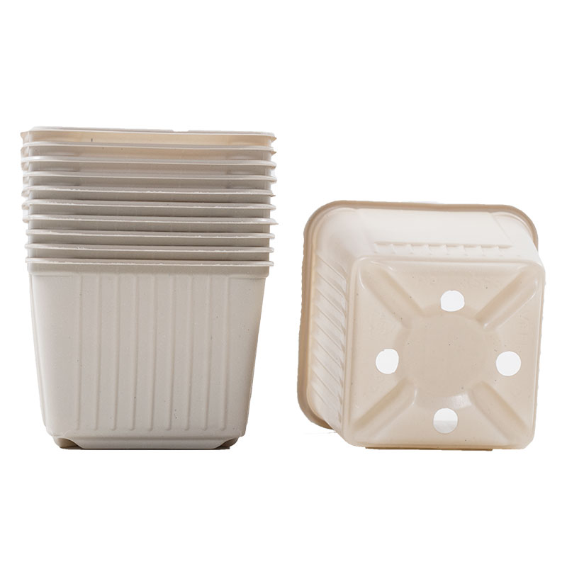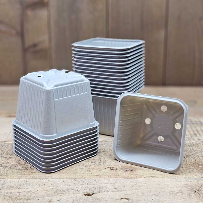 Fyrkantiga, ljusgrå krukor i mjukare plast. Perfekta för skolning av plantor, frösådder och sticklingar.