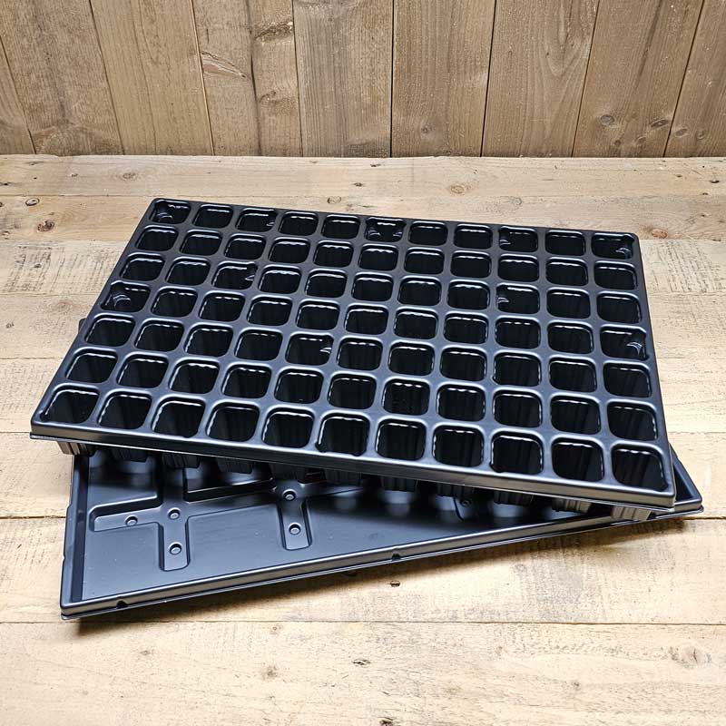Pluggbrätte (8206) i stadig plast med 77 celler som vardera mäter 40x40x53 mm.