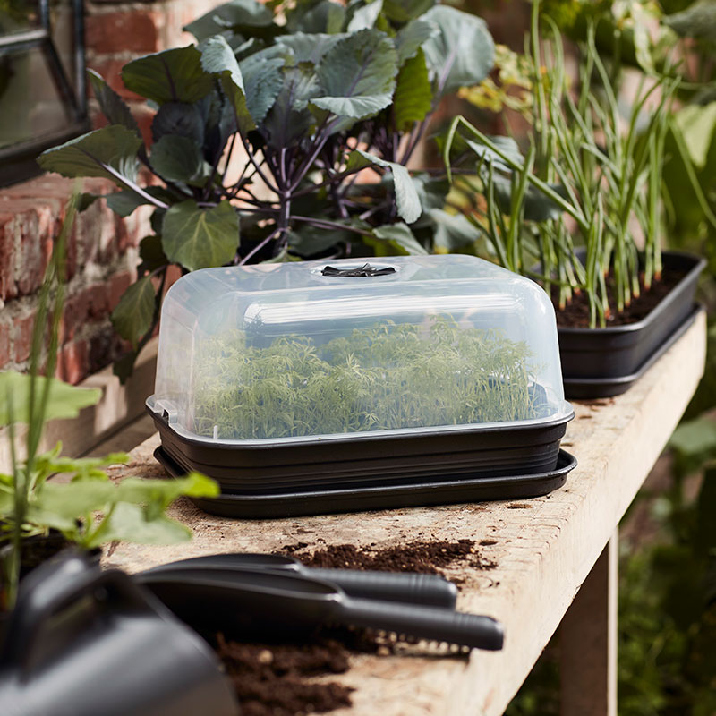 För ett optimalt resultat, använd kupan från 'Green Basics'. Detta skydd kan enkelt placeras över sålådan och uppmuntrar växterna till tillväxt tack vare det perfekta klimatet.