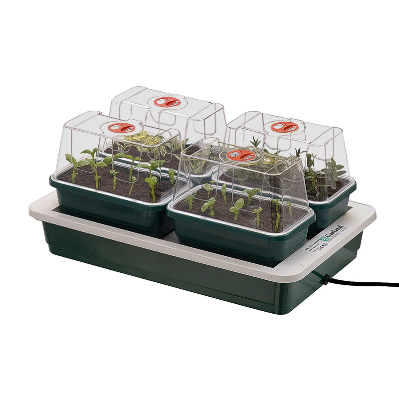 Fyra miniväxthus med undervärme för effektiv plantuppdragning.