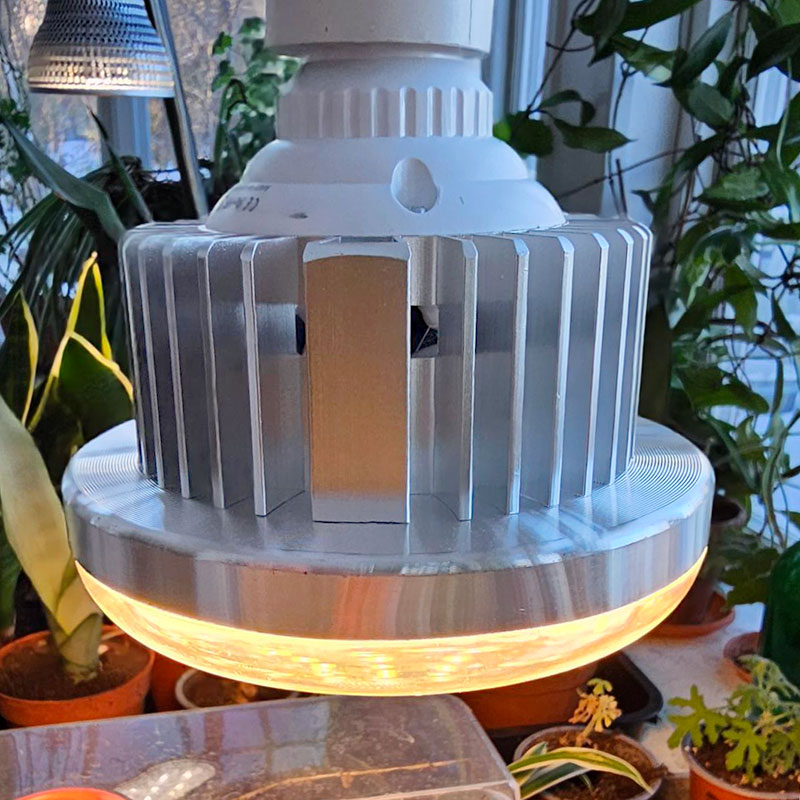 Lampan skruvas enkelt i en standard E27-sockel, vilket gör den smidig att använda i befintliga armaturer. Den integrerade aluminiumkylflänsen säkerställer effektiv värmeavledning, stabil drift och lång livslängd – upp till 50 000 timmar. Samtidigt är energiförbrukningen låg jämfört med traditionella växtlampor.