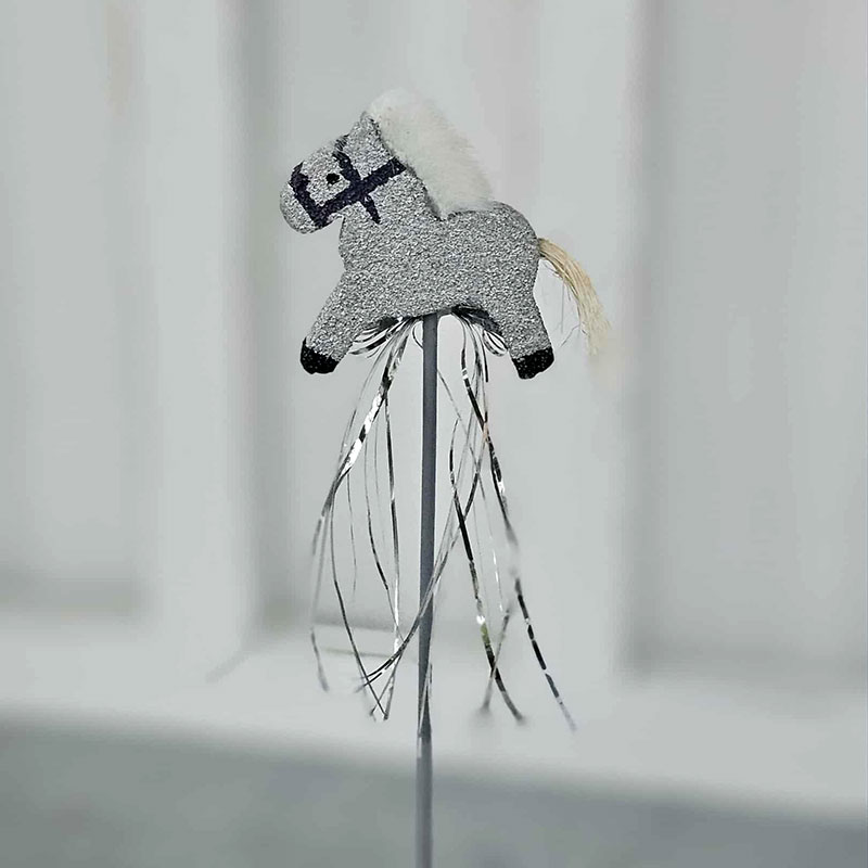 Häst på pinne med glittrigt silver.