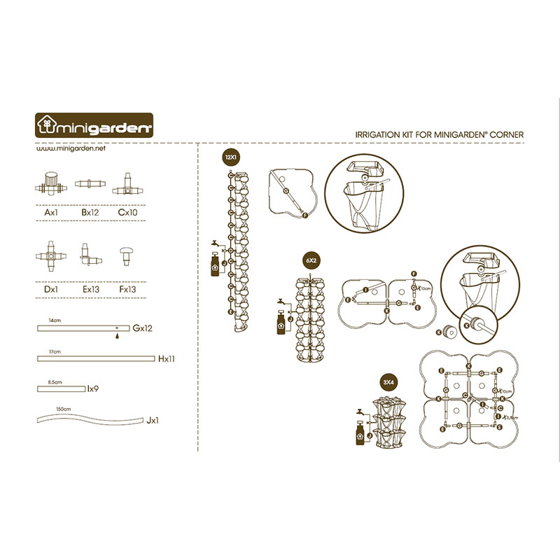 Systemet är designat för att vattna upp till 12 plantor, dvs. 12 Minigarden Corner-moduler. Den är skalbar för upp till tre (36 plantor) och kan kombineras med bevattningsset för Minigarden Vertical för användning även i större konfigurationer av Minigarden.