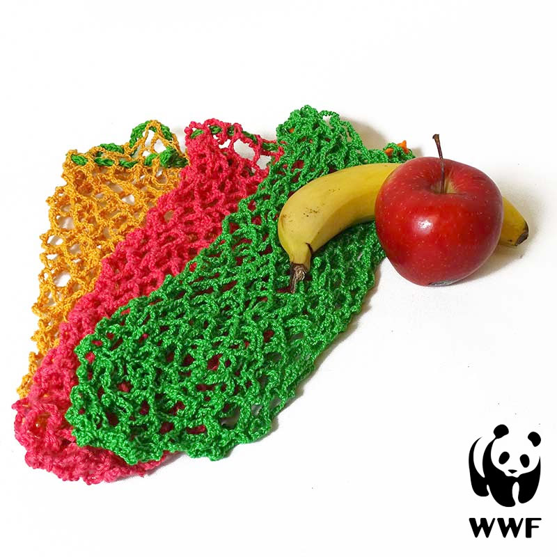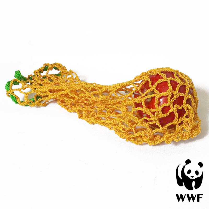 Virkad fruktpåse WWF, lokalt virkad påse av restgarner. Hela beloppet skänks till WWF