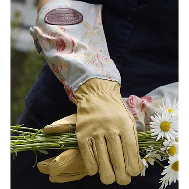 Dessa trädgårdshandskar har den klassiska engelska lantstilen med handdel i vattentåligt mjukt läder och långa skaft i vaxat linne som skyddar mot vassa taggar.