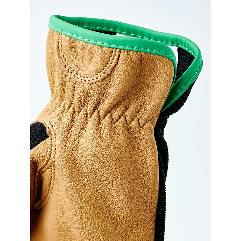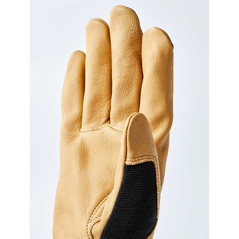 Tillverkad i slitstarkt getskinn med förstärkta fingrar och tumme.