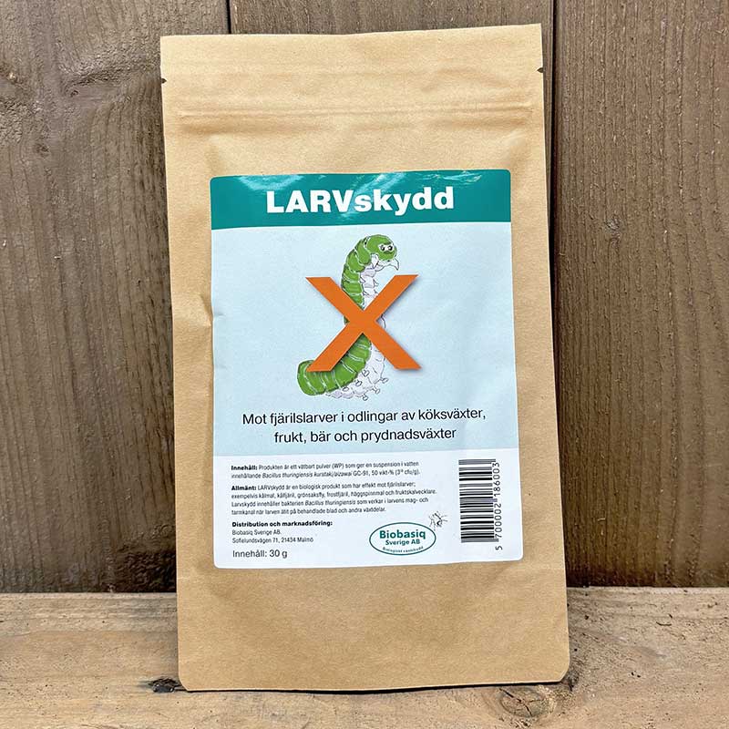 LARVskydd är en mikrobiologisk produkt som består av bakterien Bacillus thuringiensis. Varje förpackning innehåller 30 gram pulver med doseringen 1-2 gr/10 m². Larver som äter av blad behandlat med LARVskydd dör inom 2-3 dygn.