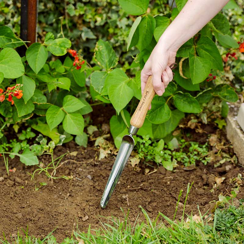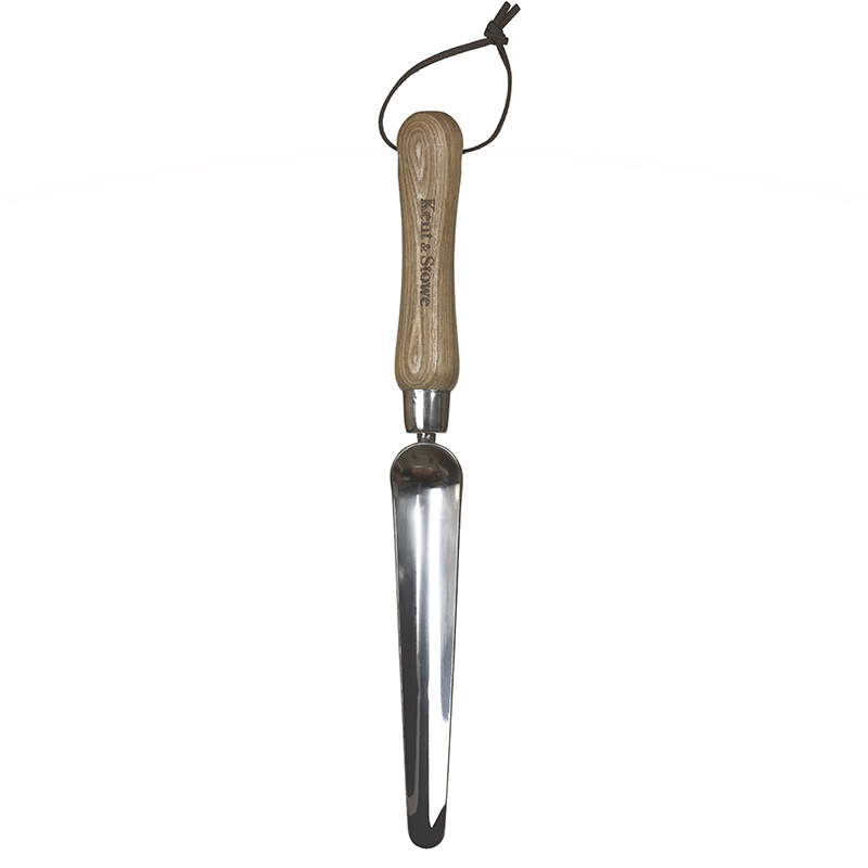En smal, rak och lång planteringsspade för plantering av smålökar, pluggplantor och andra småplantor.