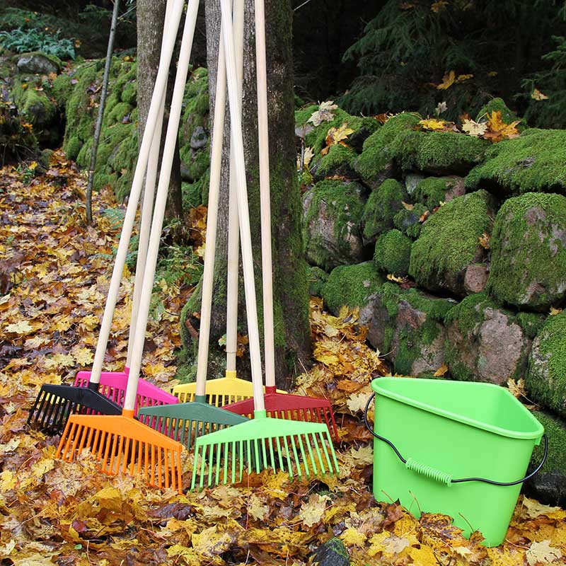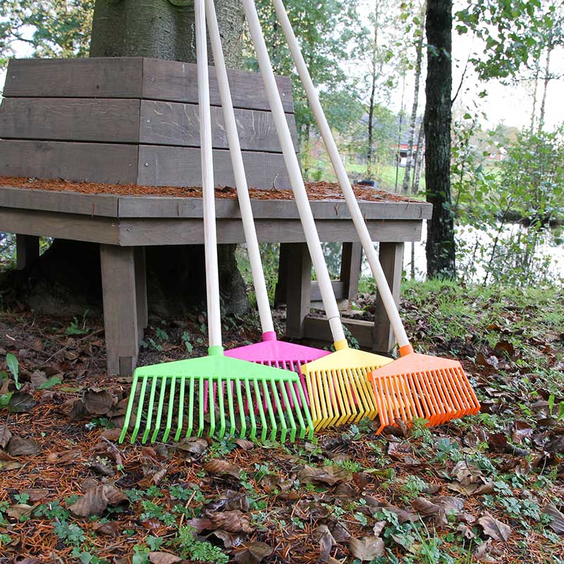 Trädgårdsräfsa i uppiggande färg som också gör den lätta att hitta.