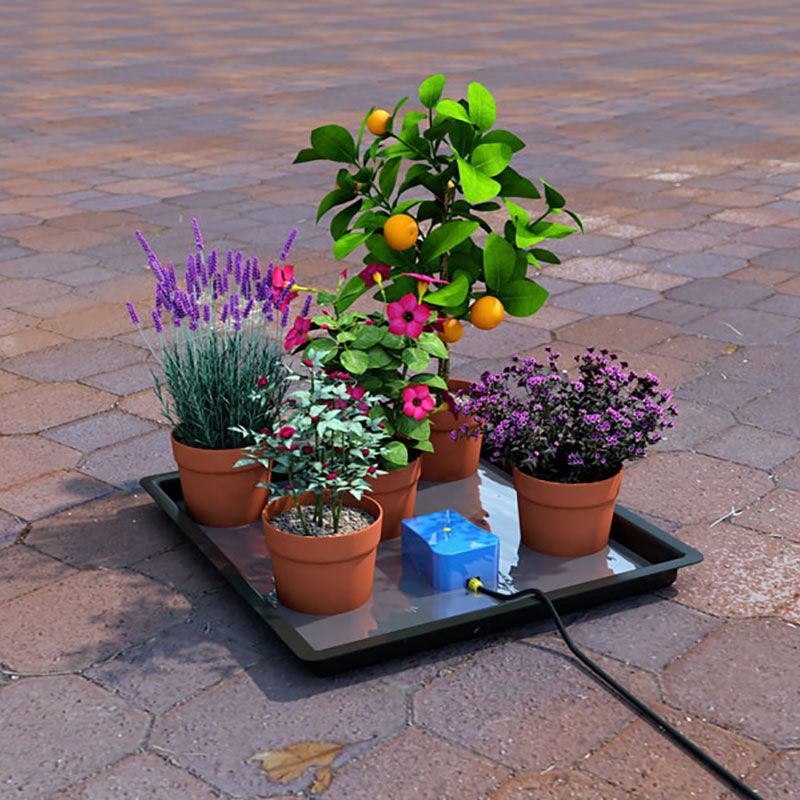 Det enkla och flexibla systemet monteras ihop på minuter och innehåller alla tillbehör som krävs för att ansluta till en reservoar efter eget val. Du behöver bara en vattenbehållare med en kapacitet på minst 30 liter och en plan trädgårdsbricka med ett minimumdjup på 30 mm och en yta på max 1,2m2.