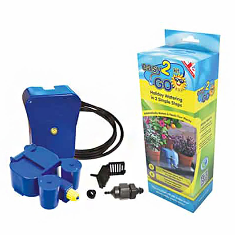 Easy2GO kit är ett välbeprövat, smidigt system för automatisk bevattning. Det fordrar ingen ström eller vatteninstallation. Principen går ut på en vattentank varifrån vattnet genom självtryck rinner ut till trädgårdsbrickan. En flottör (AQUAvalve) sköter mängden vatten som skickas ut och ser till att plantorna torkar upp mellan vattningarna i en slags ebb- och flodcykel.