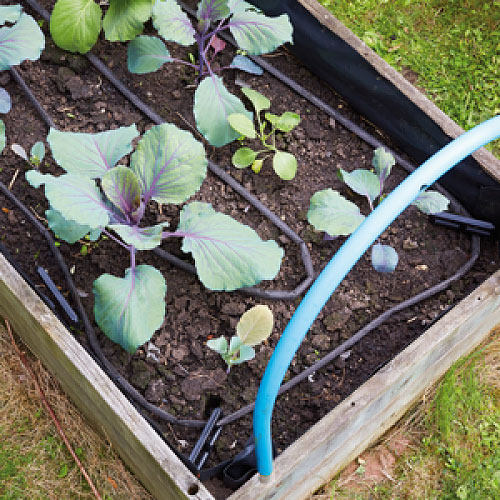 Till slangen pluggar du in droppmunstycken som ser till att vattnet hamnar precis där du önskar. Sätt fler eller färre munstycken om du önskar variera vattenmängden. OBS! Sätt munstycket en bit ut från stjälken så att rötterna lockas utåt och vatten inte samlas inne vid rothalsen. För odlingen i växthus är solcellsdriven bevattning med droppslang eller svettslang särskilt effektivt. Systemet kan kopplas till en behållare med växtnäring för enkel, automatisk droppbevattning av tomater och andra växtslag i odlingsbädd eller kruka.