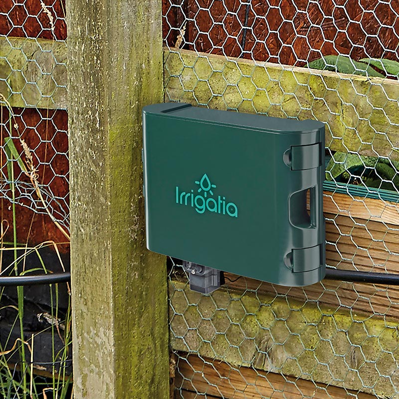 En större storlek av det populära solcellsdrivna bevattningssystemet Irrigatia. Systemet är helt drivet av de uppladdningsbara solcellerna och tar hänsyn till vädret för att ge optimal mängd vatten till växterna.