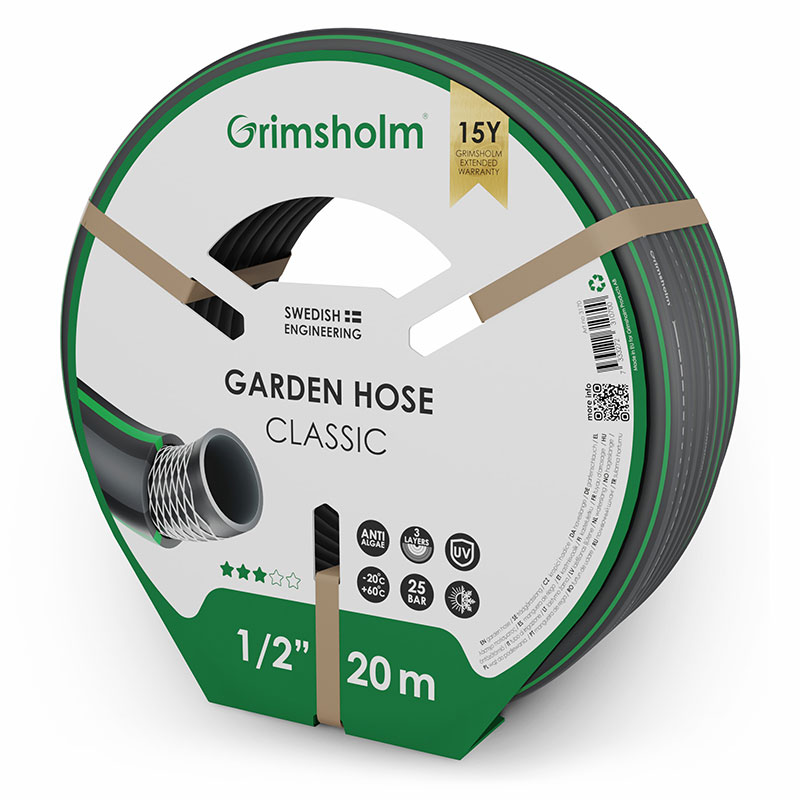 Classic är instegsmodellen i Grimsholms sortiment av vattenslangar – ett pålitligt och användarvänligt val för dig som söker en smidig lösning för vardaglig bevattning i trädgården.