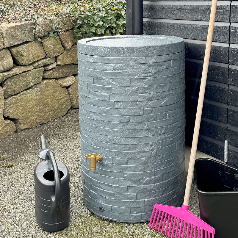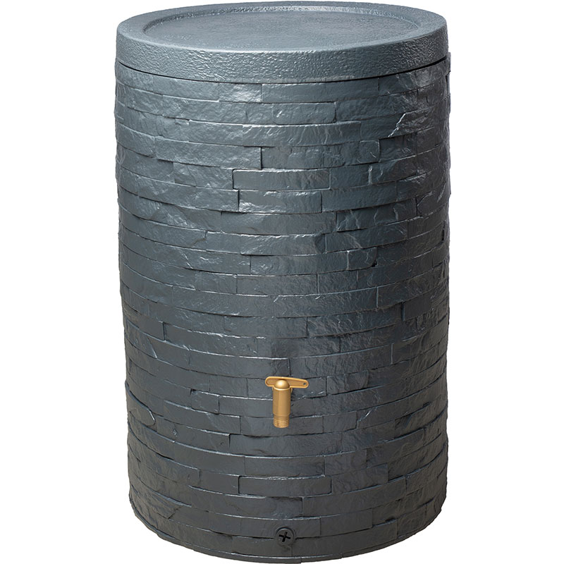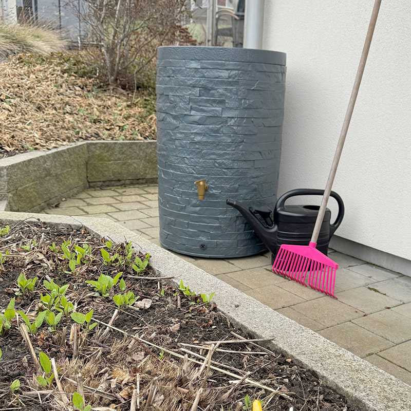 Öland - en rund regnvattentunna med ytstruktur som ser ut som sten. Samla regnvattnet som sedan kan användas för bevattning.