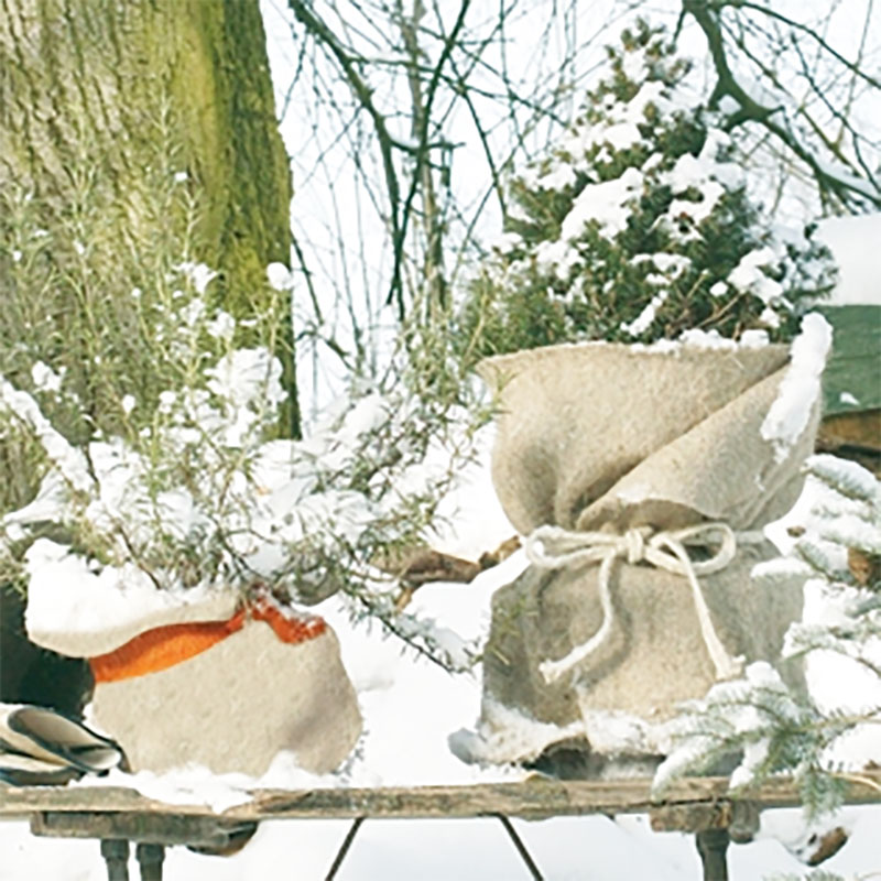 Tovad jutefilt är ett naturligt isolerande material lämpligt för isolering av krukor mot frost samt för täckning av känsliga stammar.