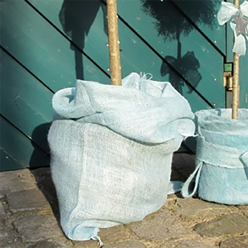 Jutesäck i färg 'Petrol Blue'. Skyddar buskar, rosor och mindre träd från kyla vind och snö och för den tidiga, starka vårsolen.
